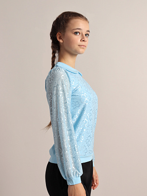 Купальник гимнастический с коротким рукавом и с юбкой из сетки в цвет основного полотна. Вырез горловины и проймы ножек окантованы бейкой из основного полотна.