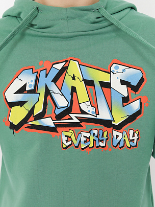 Толстовка с длинными рукавами, притачным поясом и манжетами. Манжеты выполнены из полотна с добавлением лайкры, пояс выполнен из основного полотна. Капюшон со шнурком и подкладкой, верхняя часть декорирована вязаной нашивкой. Перед декорирован принтом "Катайся каждый день".