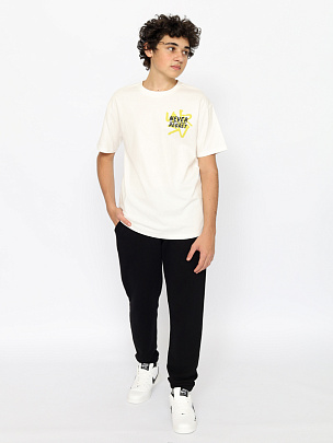 Футболка oversize со спущенным плечом, с коротким рукавом. Горловина круглая, обработана притачной бейкой из рибаны с лакрой. Плечевые швы смещены на перед и отстрочены. По переду вдоль правого бокового шва - текстовый принт.
