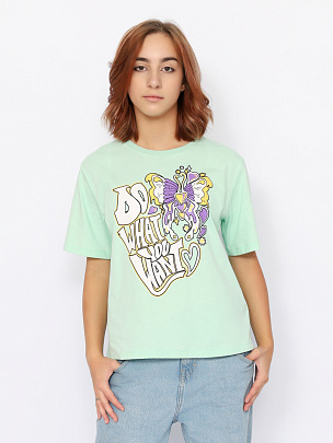 Футболка oversize с короткими рукавами. Горловина круглая, обработана притачной бейкой из рибаны с лайкрой. Перед футболки декорирован принтом с использованием глиттера.